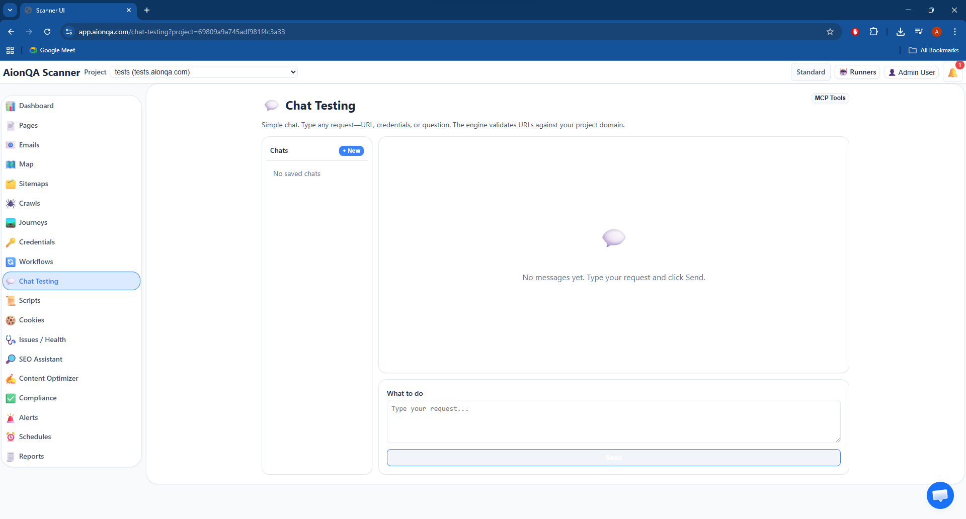 A chat-oriented surface for guided testing requests and quick exploration within the project context.