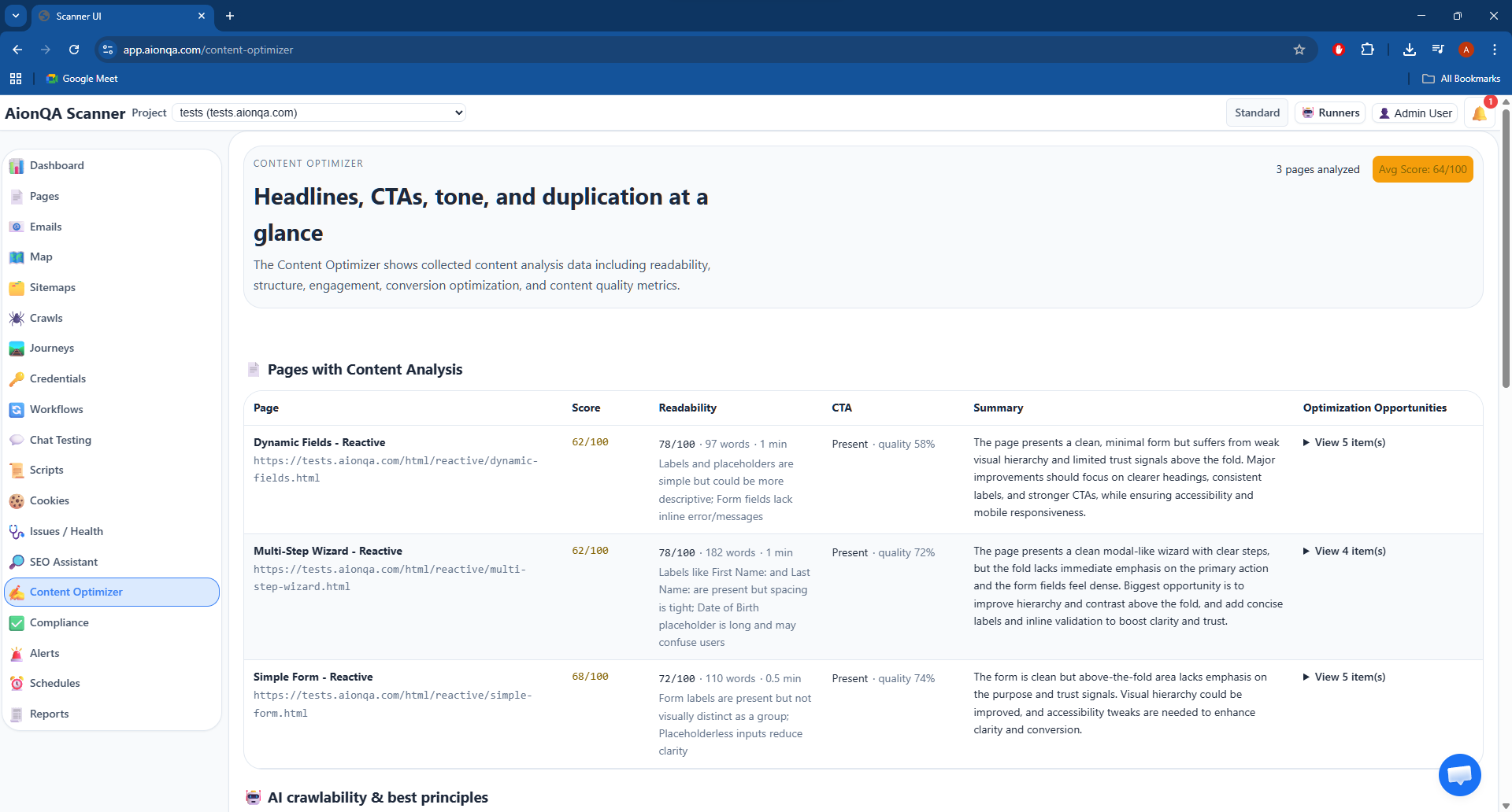 Review readability, CTA presence, duplication, and page-level content quality signals in one place.